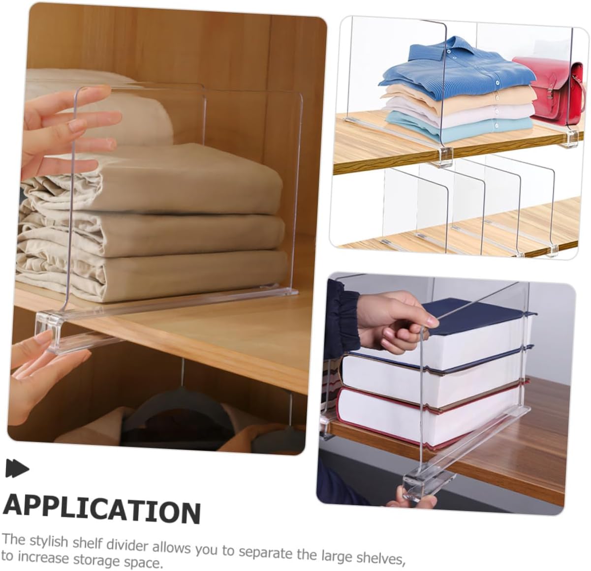 Package Include 6 x Shelf Dividers Features -Color:Transparent clothes dividers for wardrobe -Material: storage dividers -Product Info:Storage board -Size:30.50X20.50X3.00cm/11.99X8.06X1.18in shelves divider -With the shelf divider, and the closet can be separated and sorted to store items shelf clothes dividers. -Clear shelf divider can be used as a practical housewarming to your friends, they will be very happy Wardrobe Shelf Dividers. -Made of and reliable material, with high durability, shelf divider is not easy to break or deform Clear Shelf Separators. -The stylish shelf divider allows you to separate the large shelves, to increase storage space Shelf Dividers For Wardrobe. -Compact and light in weight design for easy to carry, sufficient quantity can meet your quantity demands clothes separator for closet.Goods InformationShelf Dividers For Wardrobe That's because our product can meet your needs.Shelf Divider For Closet If you are looking for a professional and storage divider, then your research is here.Shelf Dividers Using stable and reliable materials, practical and .Clothes Organizing Separator It is not easy to deform, which brings you of convenience