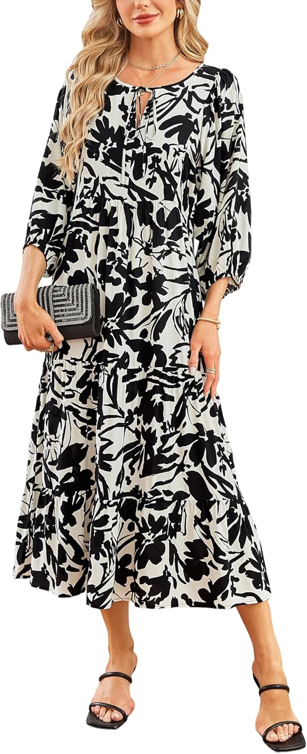 Elegance has a secret -- High quality, comfortable material and timeless classic design are committed to bring you to do quality shopping experience.Some Design DetailsLightweight Fabric-- has good wear resistance so that you wear comfortable and attractive.Casual V neck-- not only show off your sexy and lovely collarbones, but also elongate the proportion of your neck and make it longer.3/4 Sleeve-- allows you to walk in a flowing way and flatter the lines of your arms.Ethnic Print Cuff-- break the dull, elegant and chic.Loose Waist-- is good to hide your tummy and arms which is really cute and fabulous.Maxi Length-- makes you look decent and slimmer and taller.Bohemian print style-- shows your free and casual attitude towards life.You can wear the boho floral dress with any scene to show your unique charm, elegance and fashion!Womens dresses casual vacation dresses for women beach long dress --Pair it with a denim jacket and boots for a sweet yet heroic look;Pair it with a blazer and heels for a sexy yet romantic look;Pair it with a knit coat and sneakers for a cute, age-reducing look;Size Chart:S: Shoulder: 12" /Waist: 37" / Sleeve: 18.9" / Length: 48.4"M: Shoulder: 12.6" /Waist: 39.4" / Sleeve: 19.3" / Length: 49.2"L: Shoulder: 13.2" /Waist: 41.7" / Sleeve: 19.7" / Length: 50"XL: Shoulder: 14" /Waist: 44.9" / Sleeve: 20.1" / Length: 50.8"XXL: Shoulder: 14.8" /Waist: 48" / Sleeve: 20.5" / Length: 51.6"Note:If our products bring your any trouble, please contact with us for free time, we will help you solve out right away.Fabric care tips: After the fabric is washed, it is best to place the wet garment on a thick cotton towel to absorb most of the moisture, and to gently pull the boho dress back to its prototype and size as it begins to dry, avoiding the crumpled mess. Don't use the dryer, let dry in natural air.