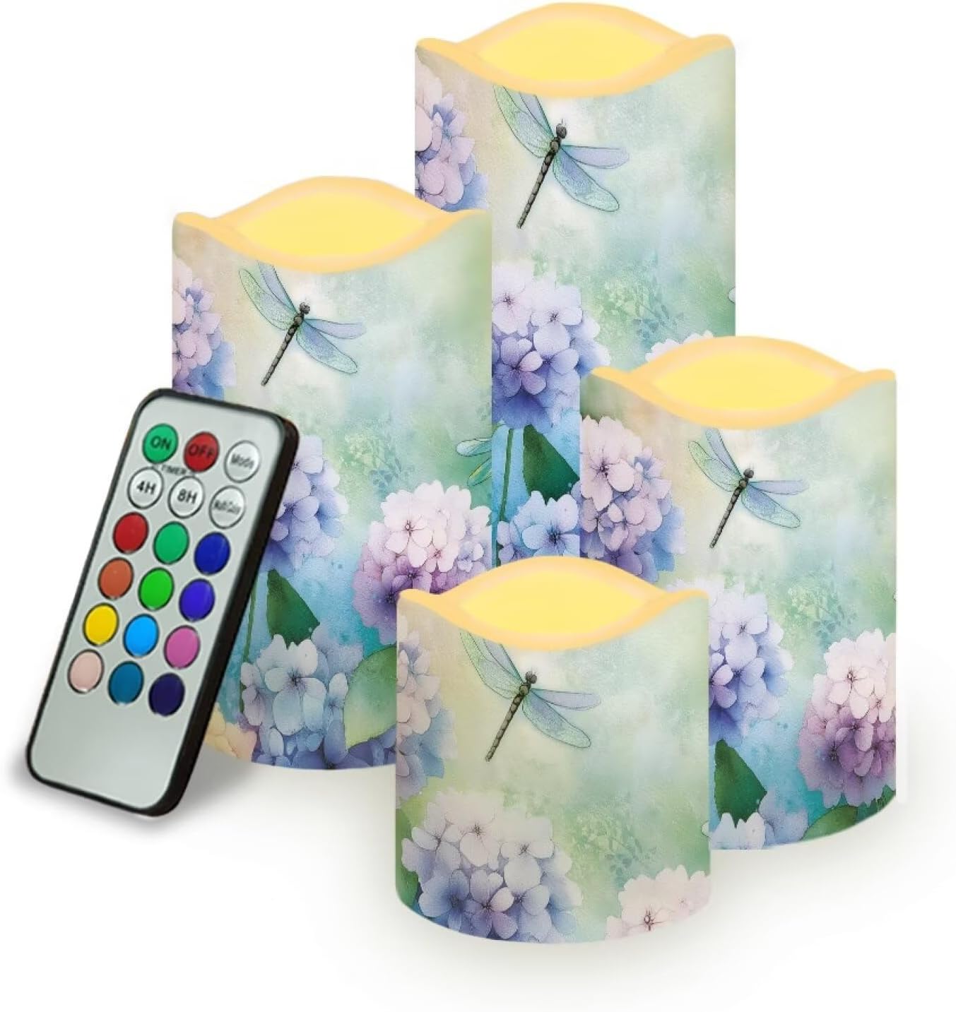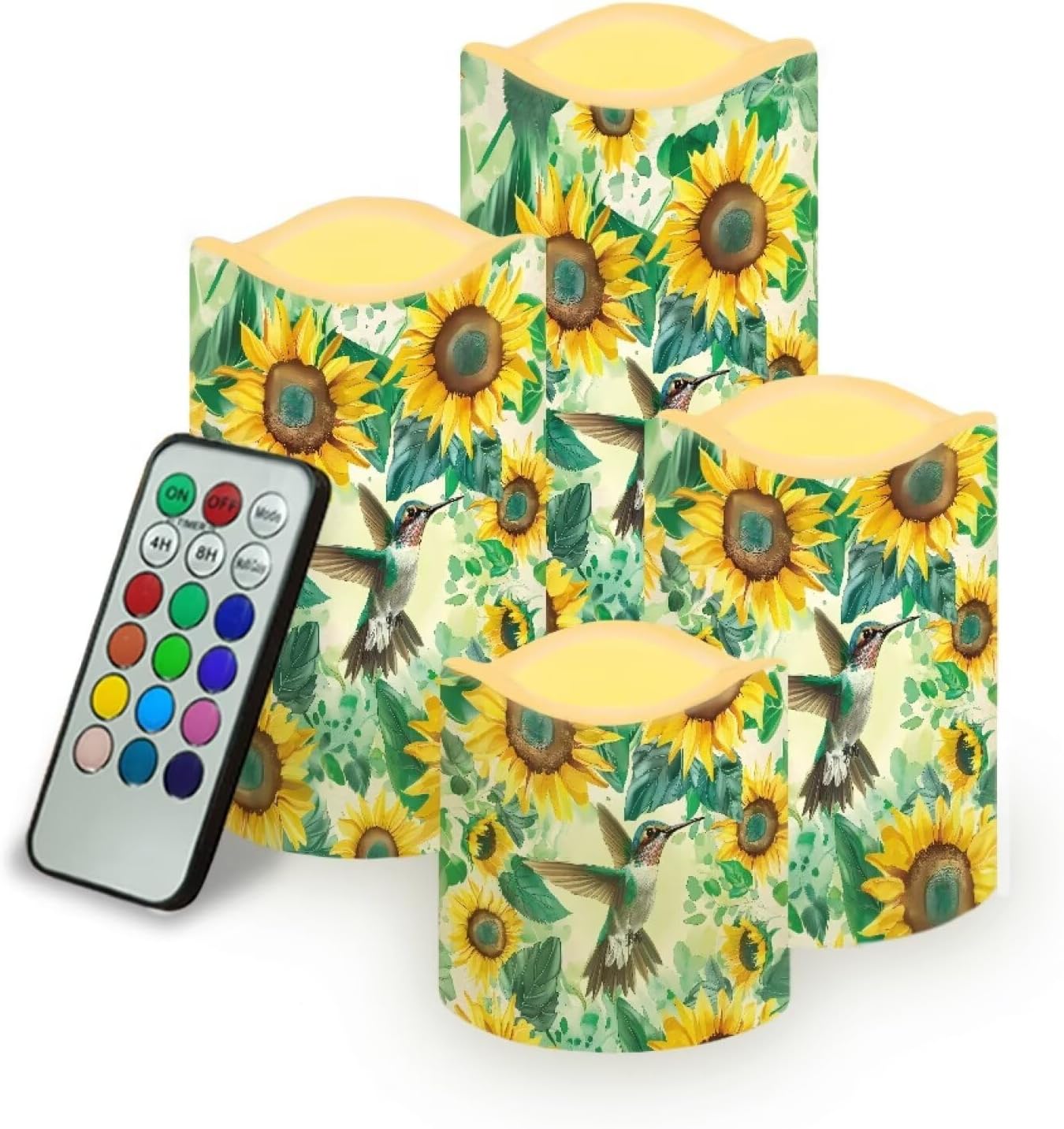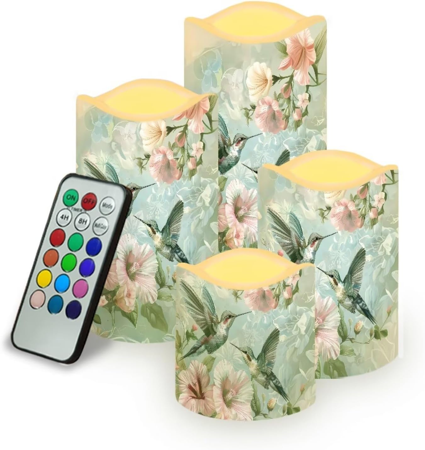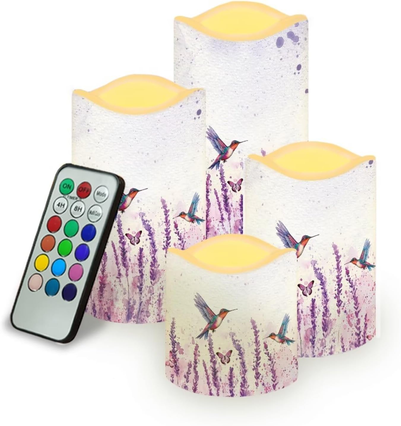 4 Packs Flameless Candles Sets(not battery include) Material:Premium frosted plastic. Color: ivory color Candles comes in 4 different size: --Diameter 7.6cm/3inch Height 7.5cm/2.9inch --Diameter 7.6cm/3inch Height 10cm/3.9inch --Diameter 7.6cm/3inch Height 12.2cm/4.9inch --Diameter 7.6cm/3inch Height 14.5cm/5.7inch Features: --with remote control,12 colors for you choose,have 4-hour or 8-hour timing mode --warm yellow tealights with miniature flicker --turn on/ off manually. --battery operated by 3 x AAA batteries. (Batteries not Included) --these flameless candles set is long lasting,buy them once, enjoy them for years to come! --suit for any spaces,any weather,indoor or outdoor. --4 pieces battery candles,create a romantic atmosphere and sparks interest for wedding,parties,home,birthday,festival and other occasions. without the worry of fire hazard, wax melting or allergic scent, warmer and peaceful atmosphere will make you enjoy your event.You will love it. Using Tips: 1.When the battery is too weak for normal power supply, your flameless candle will dim light, please turn off the candle and replace the battery. 2.Do not mix old or new batteries. 3.when not in use for a long time, please remove the battery from the LED candle. Note: 1.Due to the different camera or lighting environment, please allow a little chromatic aberration. 2.Due to different measurement methods, please allow an error of 1-3mm. Thank you! 3.Thank you for your business! If you have any questions, please don't hesitate to contact us directly.