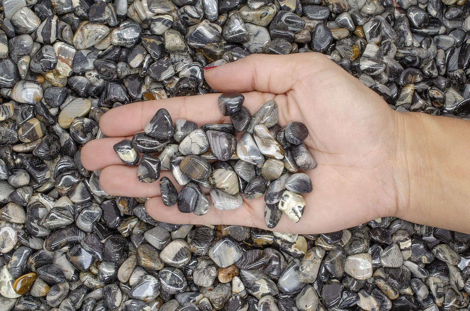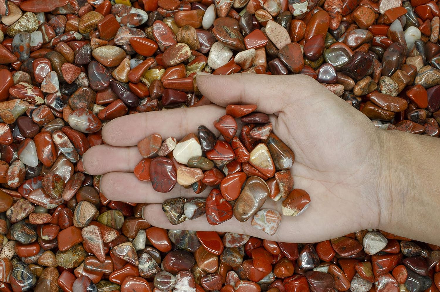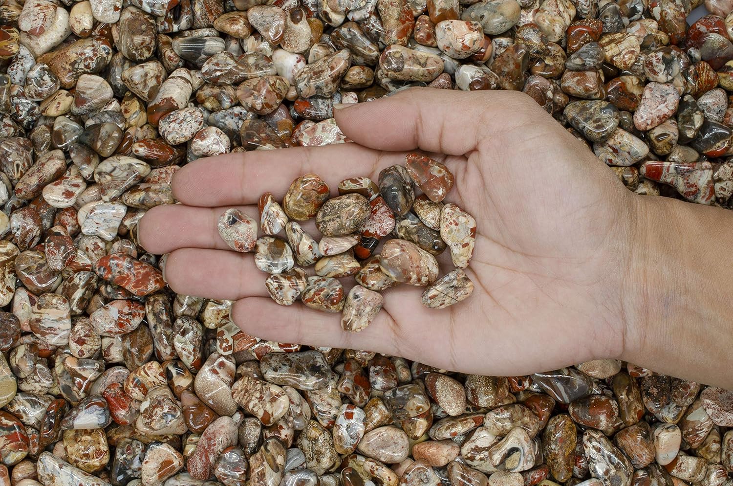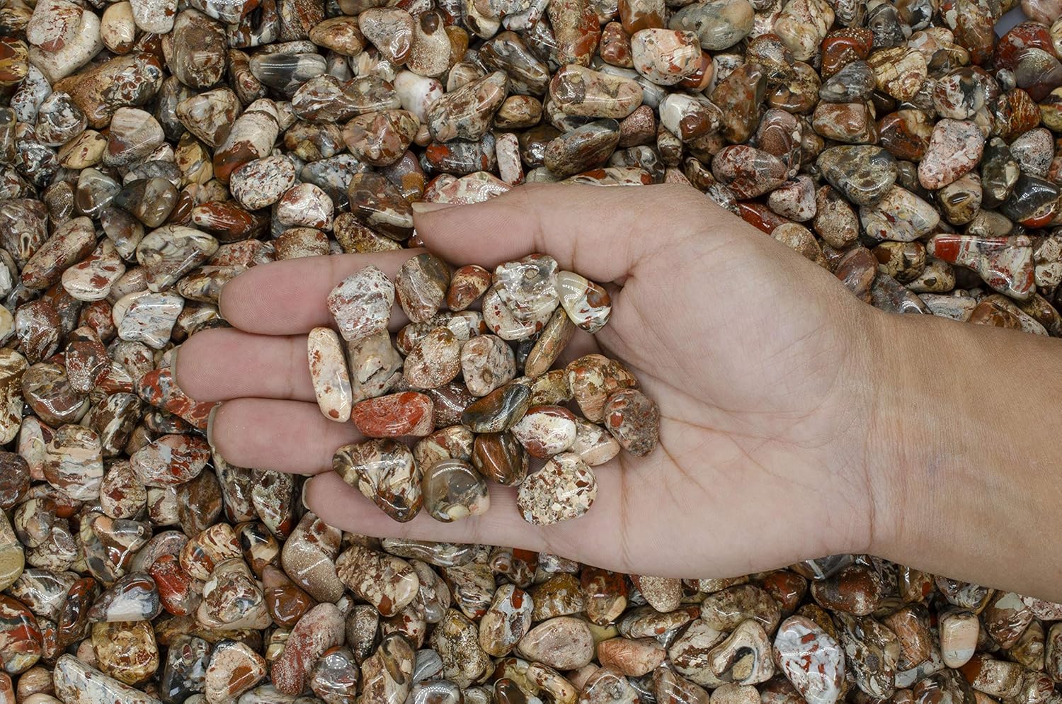 Fantasia is a USA based mining company located in Massillon Ohio providing good old fashioned American quality control to ensure every stone sent is beautiful. Fantasia starts with premium grade African rough stones which are tumbled using Fantasia's proprietary tumbling techniques. This brings out the naturally beautiful colors, patterns, shine, luster and energy in every stone.Some of the many stones used in this mix include: Amethyst, Apricot Quartz, Banded Jasper, Black and Cream Chert, Bloodstone, Blue Chert, Blue Howlite, Blue Tiger Eye, Brecciated Jasper, Carnelian, Chevron Amethyst, Dark Purple Amethyst, Dragon Stone, Epidote, Fine Line Agate, Flower Jasper, Gold Tiger Eye, Green Chalcedony, Green Chert, Grey Botswana Agate, Guinea Fowl, Nguni Jasper, Picture Stone, Rainbow Jasper, Red and White Jasper, Red Carnelian, Red Jasper, Red Lined Agate, Red Tiger Eye, Rose Quartz, Satin Leaf Jasper, Silver Leaf Jasper, Snowflake Epidote, Sodalite, Speartite, Unakite, Unpolished Turquenite, Voegesite, White Howlite, Wine Red Quartz and MORE!Your order will contain multiple pieces with varying stone types, sizes, shapes and patterns as shown in the images which is equal to or greater than the total weight purchased. In most cases the size of each stone is between 0.75" to 1" each, but it is possible to get some stones smaller or larger than these averages. While most stones in this mix are undyed it is possible to receive dyed blue howlite in this mix.VERY IMPORTANT: With all tumbled stones there are some material types which will have imperfections even after being meticulously tumbled due to their natural characteristics. While rare, due to the fragile nature of tumbled stones it is also possible minor chipping may be found on some of the stones received. The number of acceptable imperfections is relative to the material type and the grade being purchased and some minor imperfections should be expected as shown in our images.