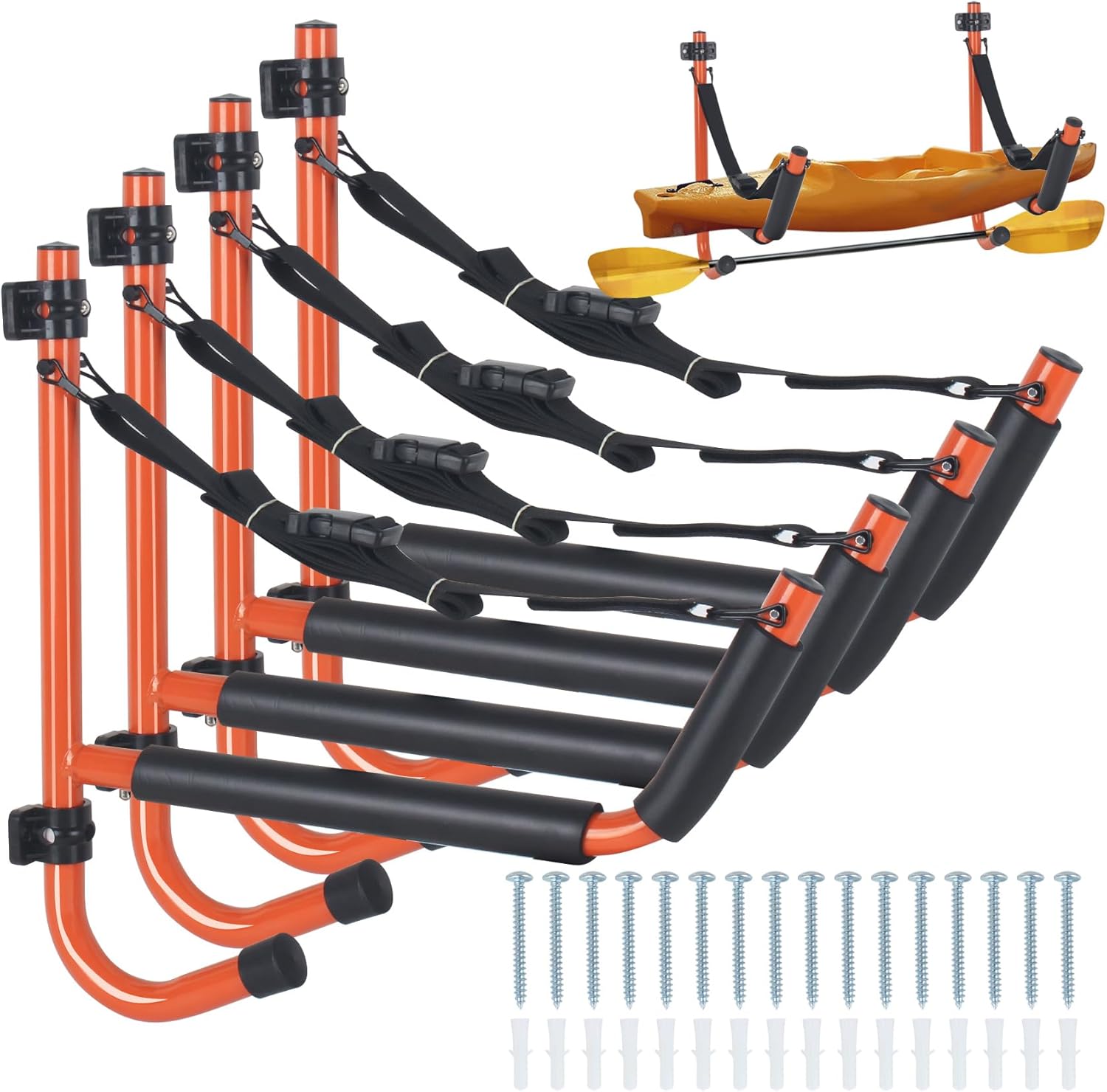 Product DescriptionProduct color:Black/OrangeMaterial: Heavy Duty SteelPole Diameter:0.9inPadding Thickness :0.15inProduct Height: 16.1 inchesProduct Width: 16.3inchesScrews Length:2.36inchesEach Pair Capacity: 100 lbsFeatures:Additional hook,Easily fold,EVA Foam ProtectPackage List:Kayak Storage RacksScrewsAnchorsAdjustable StrapsInstruction Manual