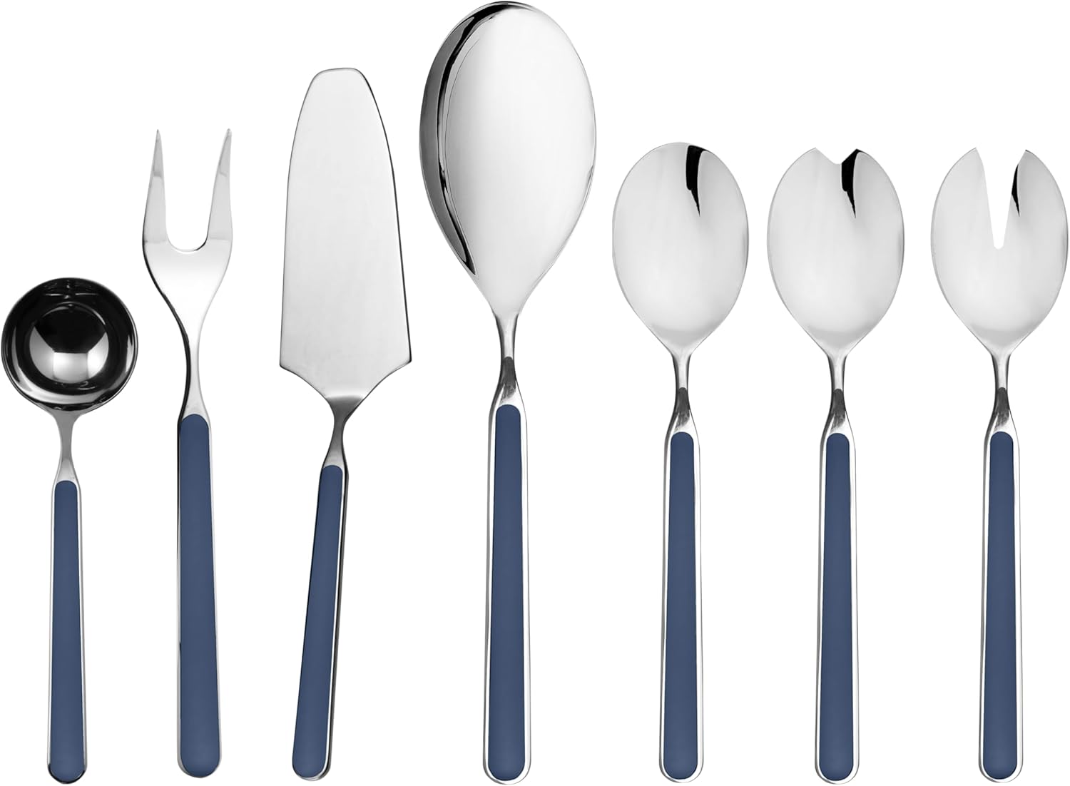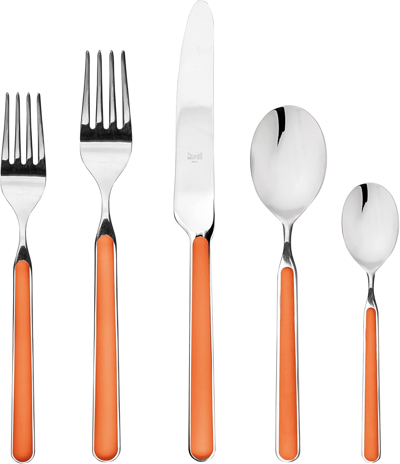 Mepra 5-piece kitchen set includes 1 Table Fork, 1 Table Knife Solid Handle, 1 American Size Table Spoon, 1 Salad Fork, 1 European Coffee Spoon. This flatware collection presents a range of premium cutlery made from thicker stainless steel. Available in 37 different color handles, the Fantasia collection adds a touch of color to everyday moments, making the simplest meals, like breakfast or a family dinner, more memorable. Mepra cutlery is designed to be durable and completely dishwasher safe. This cutlery is resistant to rust, corrosion, fading, tarnishing, and chipping to ensure a long-lasting flatware set. Improved with NEW size American coffee spoon!