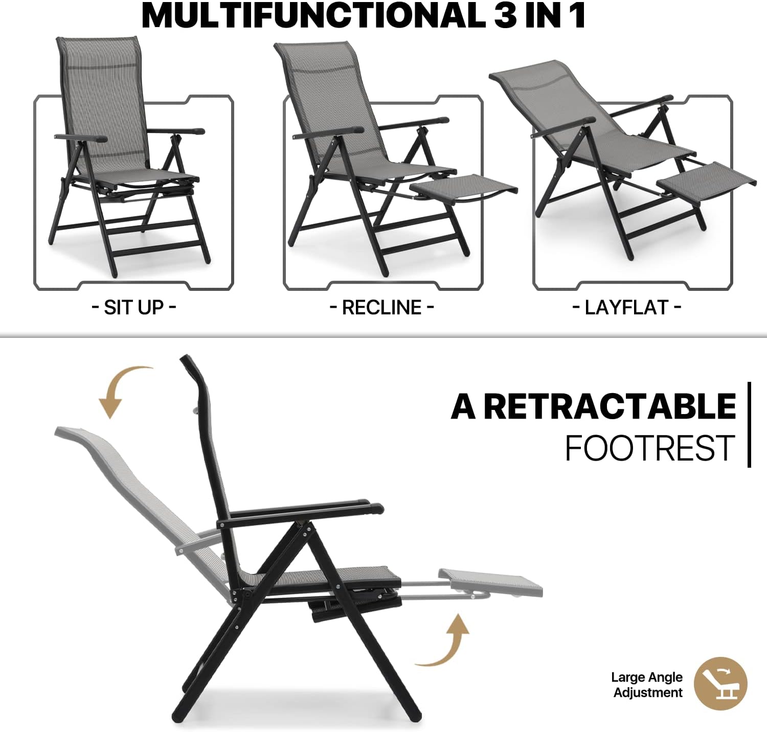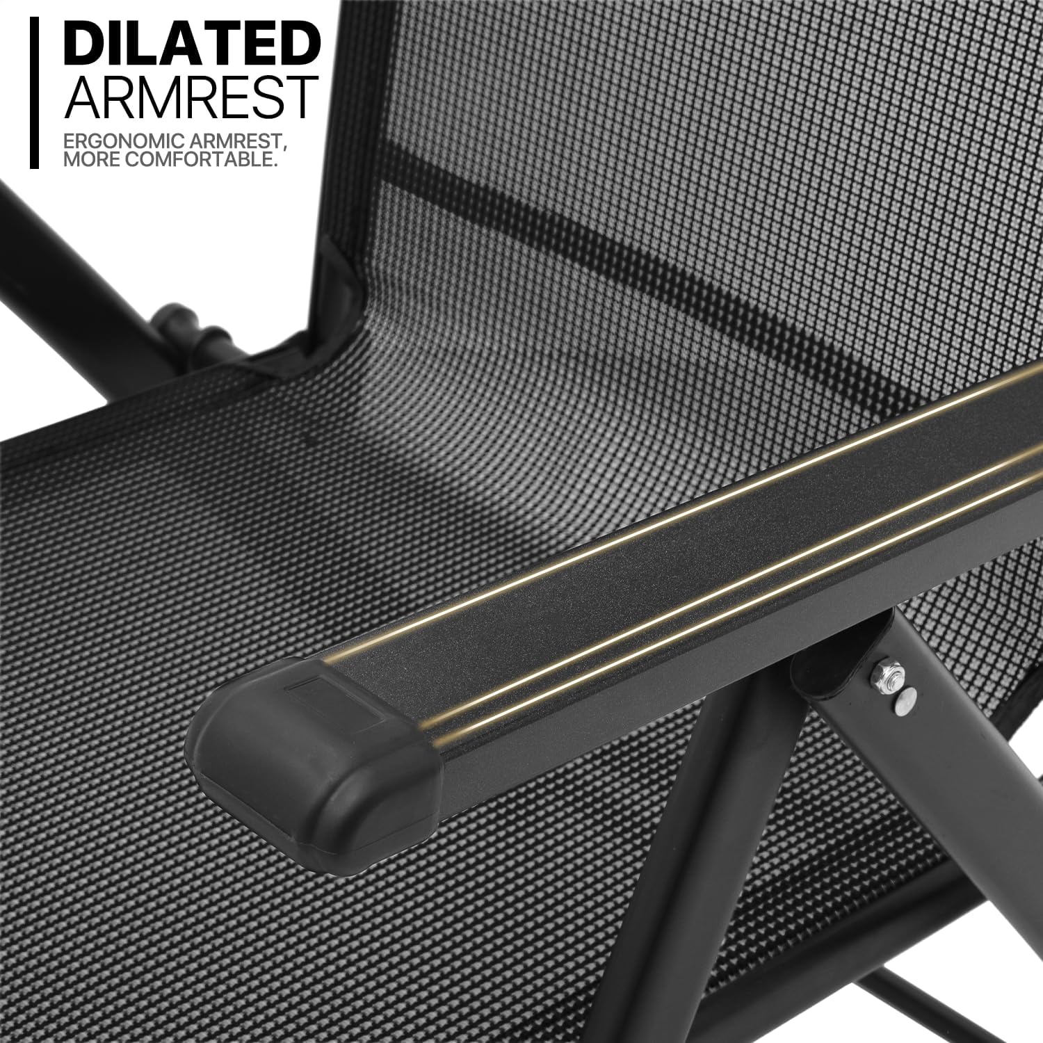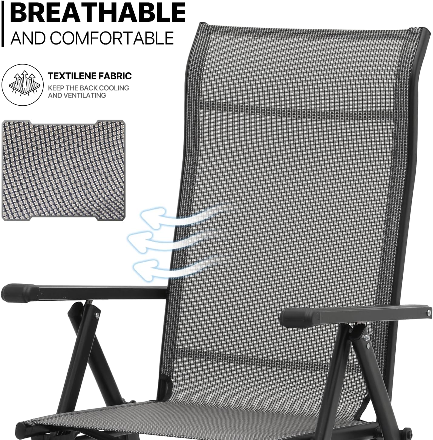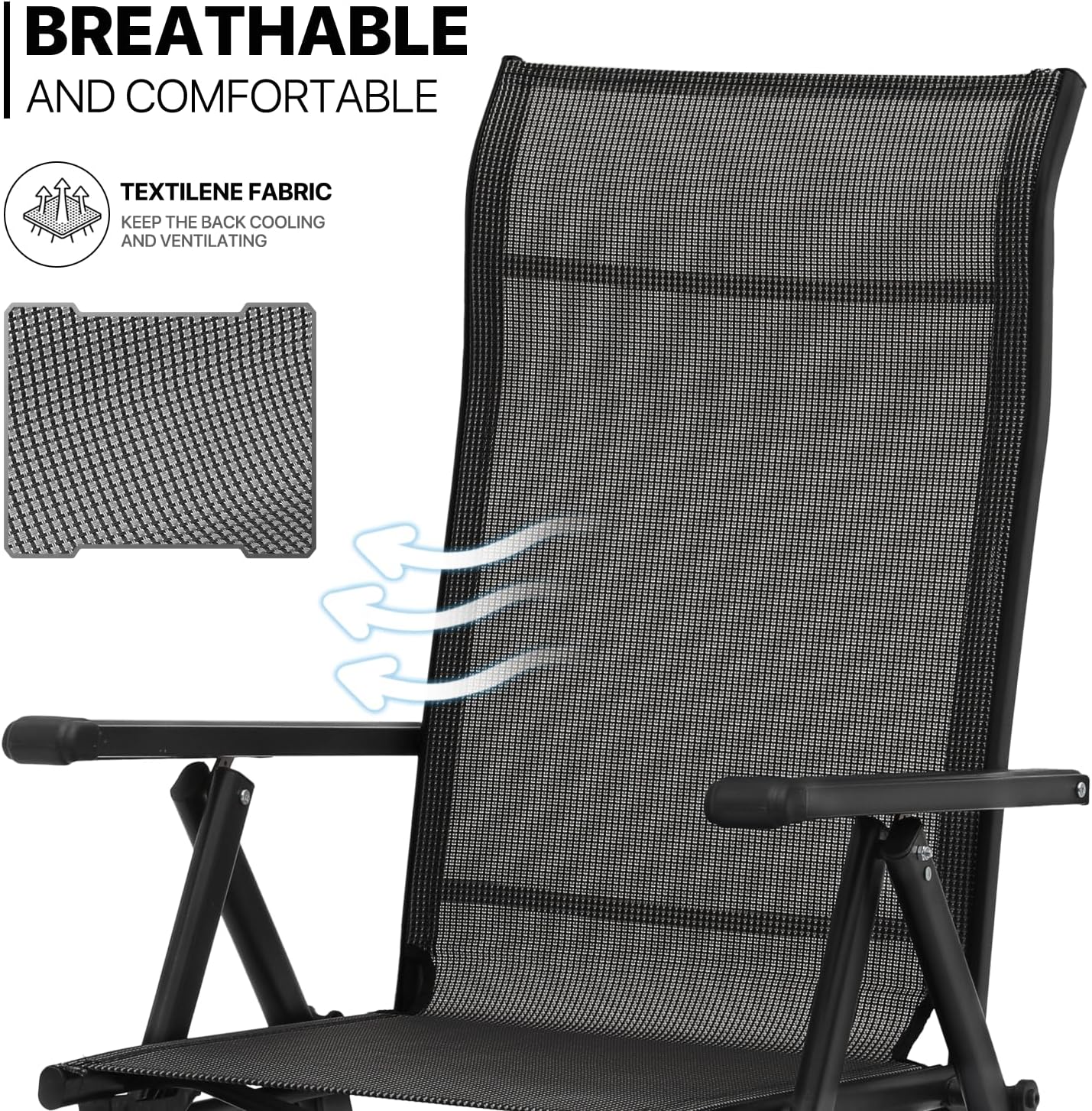• Comfortable Sitting Experience - Designed with ergonomic armrests and high backrest, our patio folding chair set fits your body curve perfectly for maximum relaxation. Moreover, the breathable fabric prevents you from feeling stuffy in the hot summer.