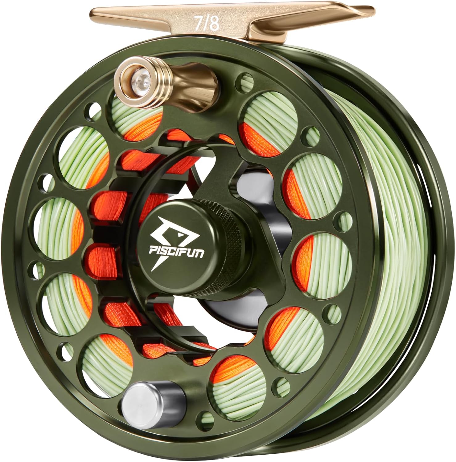 Three-Year Warranty and 100% satisfaction service! Contact us on Piscifun Website if you have any problems with the Piscifun products.LINE WEIGHT 3|4 WEIGHT(OZ) 4.1 DIAMETER(IN) 2.9 WIDTH(IN) .83 BACKING CAPACITY WF3F/50yds/20lbs LINE WEIGHT 5|6 WEIGHT(OZ) 4.7 DIAMETER(IN) 3.4 WIDTH(IN) .91 BACKING CAPACITY WF6F/100yds/20lbs LINE WEIGHT 7|8 WEIGHT(OZ) 6.1 DIAMETER(IN) 3.7 WIDTH(IN)1.06 BACKING CAPACITY WF7F/125yds/20lbs LINE WEIGHT 9|10 WEIGHT(OZ) 6.7 DIAMETER(IN) 4.05 WIDTH(IN)1.07 BACKING CAPACITY WF7F/150yds/20lbs Drag click: Yes Reversible: Yes Drag type: Disc Reel bag: Yes Palming rim: Yes Material: Machined 6061-T6 aluminum PISCIFUN Reels has always stood for quality fly reels at a reasonable price, and the new SWORD is the perfect example of this value. The Piscifun Sword features a mid-arbor design that reduces line memory while also facilitating lightning-quick line pickup-something that is vital when trying to keep up with big fish on blistering runs. The Sword's enclosed infinitely-adjustable super-smooth disc drag and protects the lightest of tippet, but has the reserve power to stop powerful fish. Mid arbor for fast line pick up, fully machined 6061-T6 aerospace grade aluminum, Cold forged and tempered for superior strength and rigidity, Hard anodized for surface protection and corrosion resistance, Concave arbor for greater strength and capacity, Easy conversion from left to right-retrieve. Available in three colors: Traditional Black. Classic Titanium and Pretty Gold. There is no longer any reason to overpay for high quality Fly Reels. Piscifun offers everything serious anglers need in a fly reel at fraction of the price of other brands.