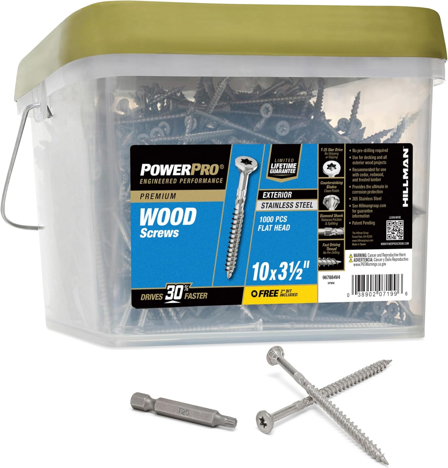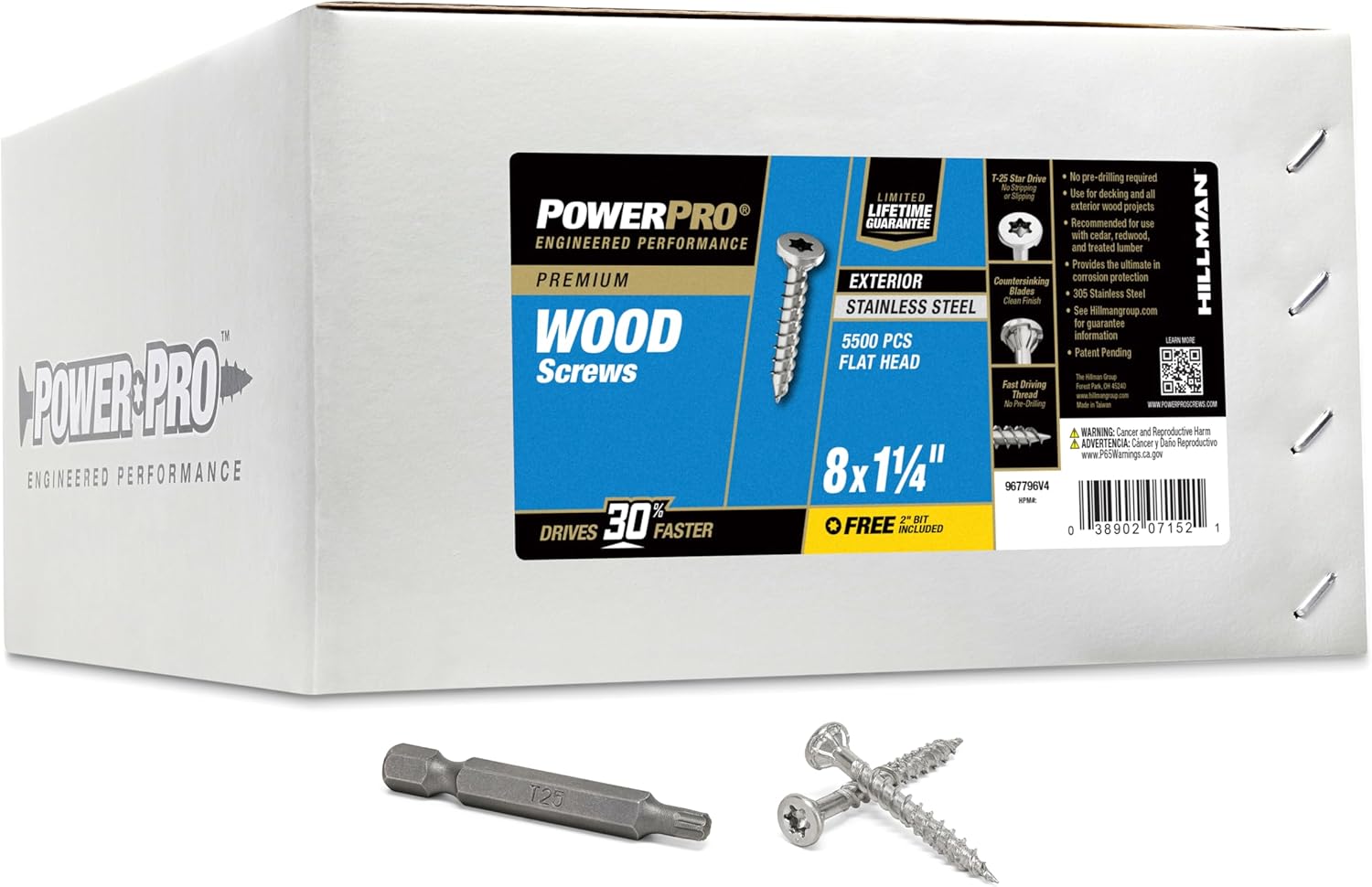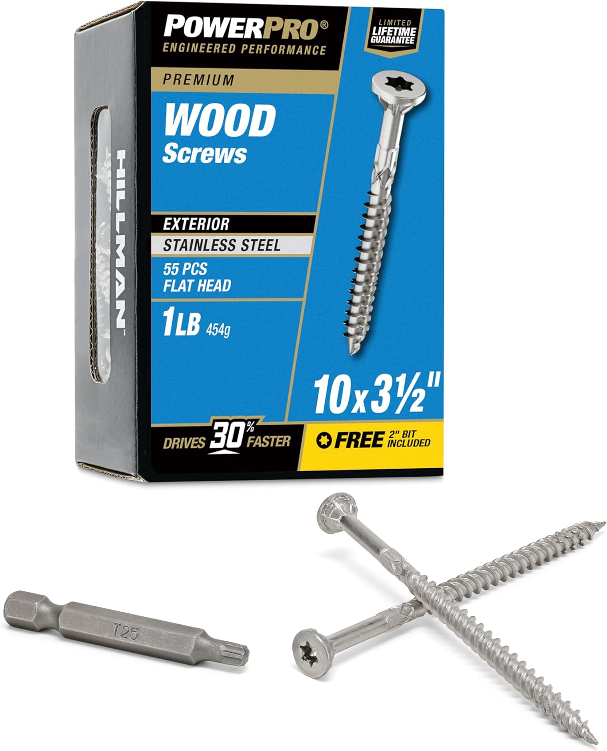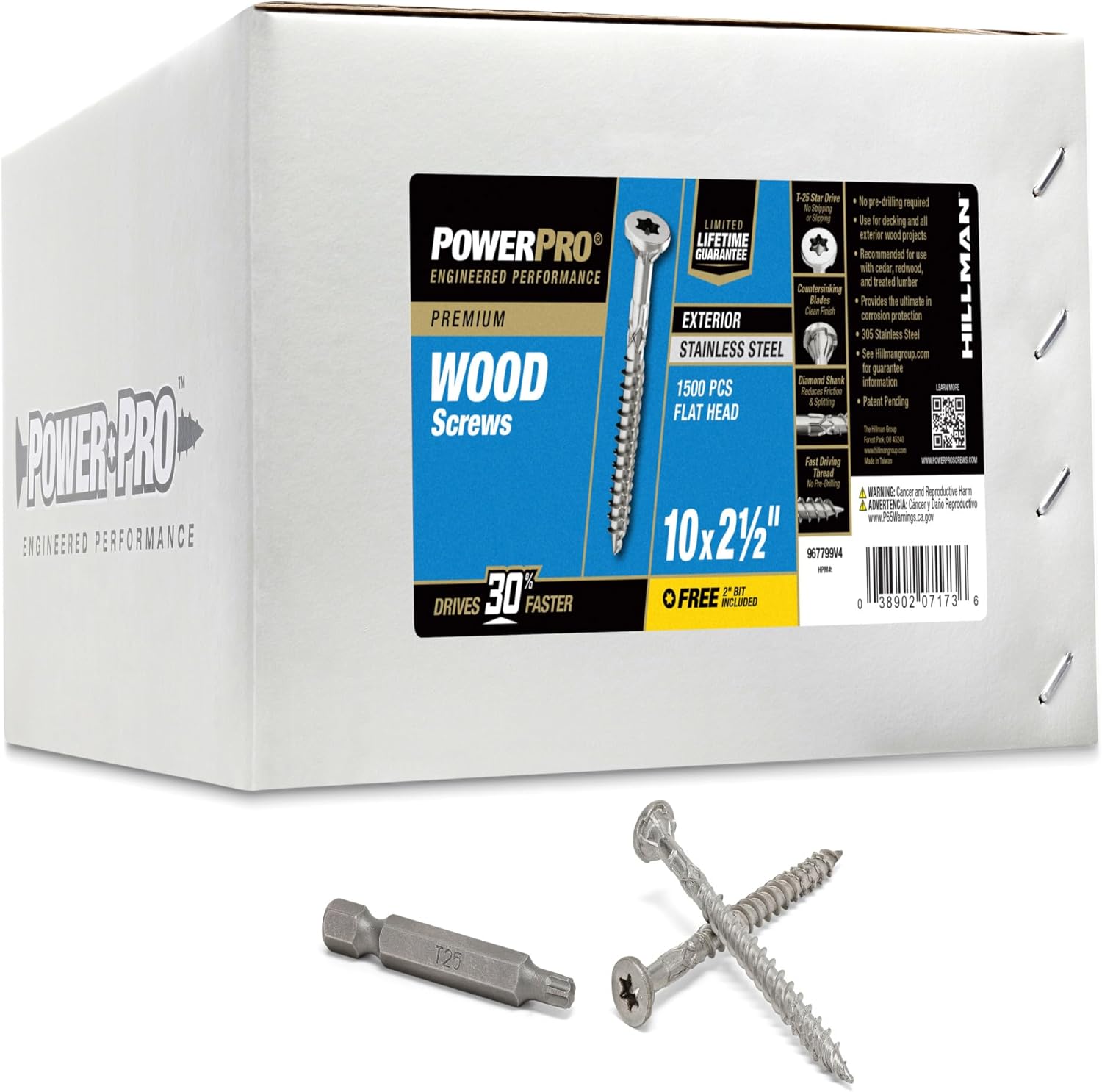Power Pro was founded to provide craftsmen with solutions that complement their hard-earned skills. We understood from the beginning that trust is earned and never freely given. So, we rigorously designed, tested, and improved our products to ensure that we delivered the unrivaled performance and quality that craftsmen deserve. The Power Pro Premium 305 Stainless Steel Exterior Wood Screws provide a versatile and reliable fastening solution for exterior wood to wood applications, making them ideal for decking, fencing, and other outdoor projects. Designed for convenience, these screws require no pre-drilling, thanks to their coarse threads and self-drilling point that eliminate the need for a pilot hole. A durable 4-layer epoxy coating ensures superior resistance to rust and corrosion, while the Star/Torx drive minimizes slippage and camout for secure installation. Each package includes a T25 driver bit for added ease, and the screws are backed by a limited lifetime warranty against rust and corrosion.