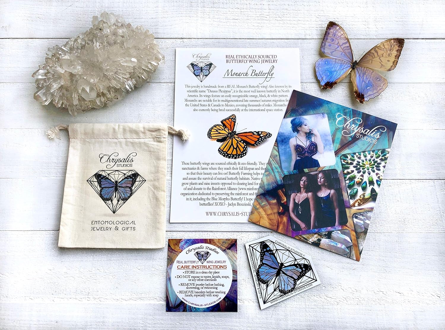 These unique teardrop earrings are made from real blue morpho butterfly wings! Or you can choose your own custom butterfly species from the 4th photo! (Read below for more on how I ethically obtain the wings). Each butterfly wing is embedded under a magnified glass teardrop measuring 18x25mm and set in your choice of silver tone, yellow gold tone, rose gold tone bronze or gunmetal. Earrings come on french hook earring wires. An upgrade to a real .925 Sterling Silver earring hooks or real 14K rose gold filled earring hooks available in the drop down menu! Each pair of earrings comes in its own custom gift pouch with literature on the species of butterfly and a free die-cut sticker or magnet! These are an Original Chrysalis Studios design 2017. Choose which type of butterfly species you would like in your earrings! (Butterfly wing species / color options going left to right in fourth "numbered" photo) *NOTE* No Butterflies are harmed in the making of my jewelry! All butterflies are raised on butterfly farms and sanctuaries and allowed to live their full lifespan, which averages about 1 month, and then collected and sold so that their beauty can live on! Butterfly Farming actually helps to preserve rain forests and also assures the survival of natural butterfly habitats. Native people are encouraged to grow plants and raise insects opposed to clearing land for cash crops. I am a member of and donate to the Rainforest Alliance, a nonprofit organization dedicated to preserving the Rainforest and the many species that live within it, including the Blue Morpho Butterfly!